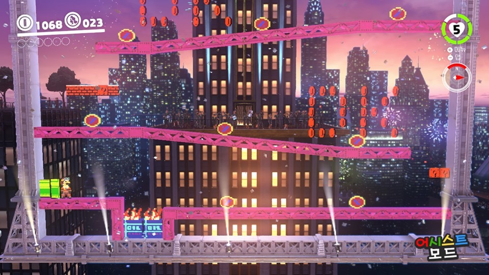 의욕적으로 만든 새로운 요소를 애써 한번에 소비하지 않고, 게임의 마무리에도 다시금 꺼내들고 상기하게 하고 그것을 유용하게 하는 반복 연출도 감탄이었다. 역시나 1회 차는 튜토리얼. 거듭된 업데이트로 통해 추가되는 코스츔, 아직도 왕국 별로 산적해 있는 파워 문과 퍼플 코인, 풍선미션 등 징그럽고 익숙한 닌텐도 방식도 한숨이 나오게 한다.