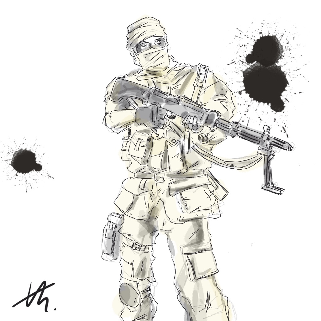 여러 FPS 풍 컷을 그리고 싶은 욕심이 있었죠. 군장류와 종기류 참 참조할게 많아요.